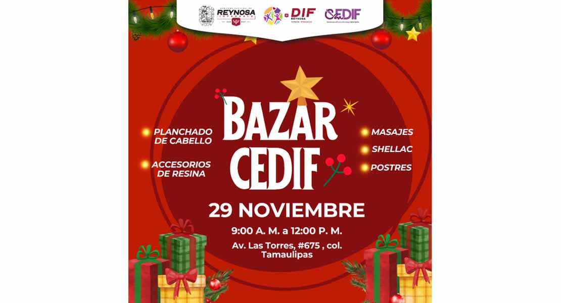 Reynosa, Tam (27-Noviembre-2025).- Con el objetivo de promover el desarrollo de habilidades y fomentar el crecimiento económico familiar, el Sistema DIF-Reynosa que preside Carlos Luis Peña Garza, invita a la ciudadanía al Bazar CEDIF, que se llevará a cabo este sábado 29 de noviembre en las instalaciones del CEDIF Las Torres, donde alumnas y alumnos presentarán los conocimientos adquiridos en sus diferentes talleres.
