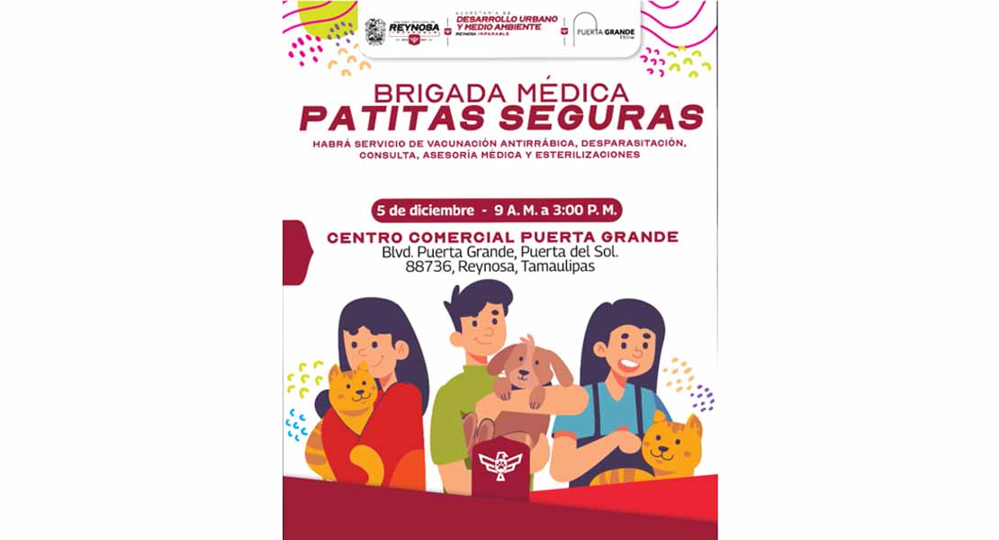 Reynosa, Tam (28-Noviembre-2025).- El Presidente Municipal Carlos Peña Ortiz te invita a darle el cuidado y salud que merece tu mascota; accede a los servicios gratuitos que llevará al centro comercial Puerta Grande, el próximo viernes 5 de diciembre de las 9:00 de la mañana a las 3:00 de la tarde.