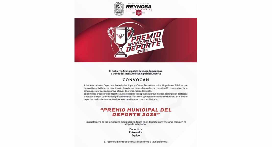 Reynosa, Tam (28-Noviembre-2025).- El Alcalde Carlos Peña Ortiz lanzó una invitación abierta a la comunidad deportiva de Reynosa para participar en la convocatoria del Premio Municipal del Deporte 2025, reconocimiento que destaca el esfuerzo, talento y trayectoria de deportistas, entrenadores y equipos que han contribuido significativamente al desarrollo deportivo de la ciudad.