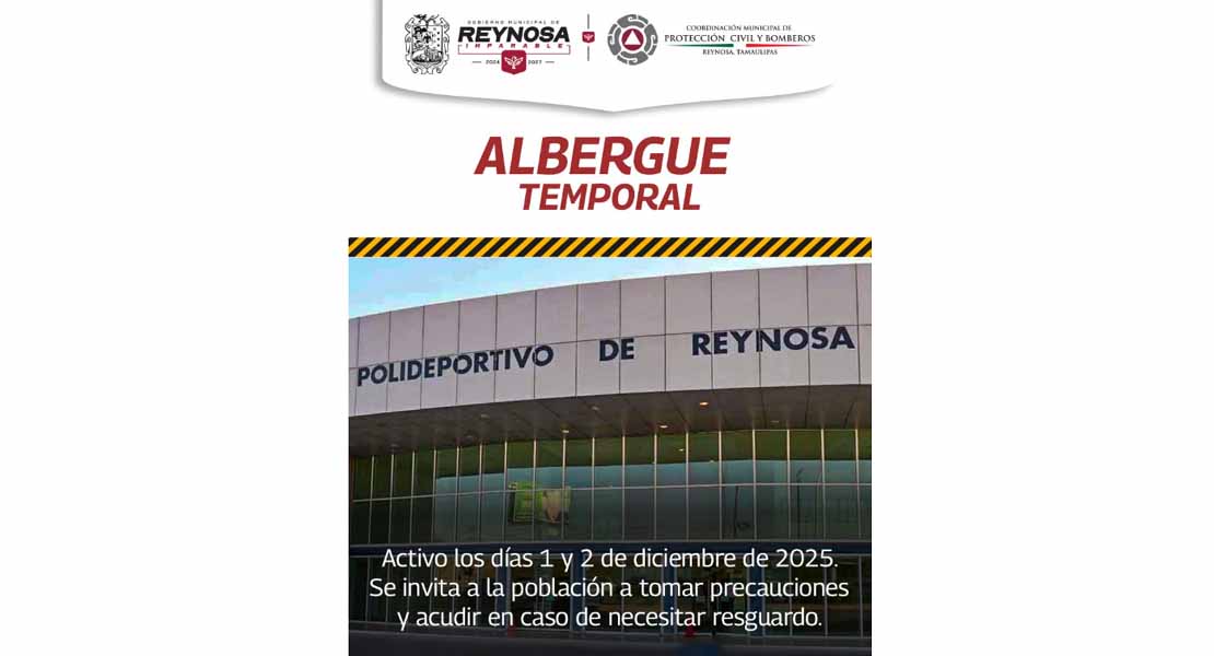 Reynosa, Tam (1-Diciembre-2025).- El Presidente Municipal Carlos Peña Ortiz habilitó el Albergue Temporal del Polideportivo Reynosa, con la finalidad de brindar, durante los días 1 y 2 de diciembre, protección cálida a personas sin hogar o en condición vulnerable ante las temperaturas que prevalecen en la ciudad.
