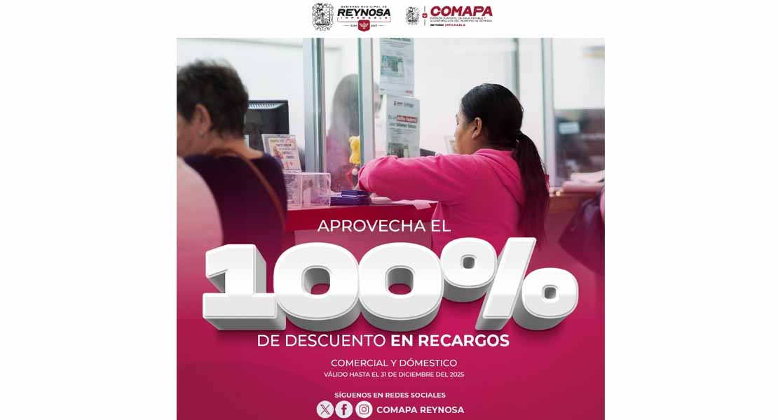 Reynosa, Tam (2-Diciembre-2025).- La Comisión Municipal de Agua Potable y Alcantarillado de Reynosa invita a las y los usuarios a aprovechar los últimos días del beneficio del 100% de descuento en recargos por adeudo en los servicios doméstico y comercial, vigente hasta el 31 de diciembre de 2025.