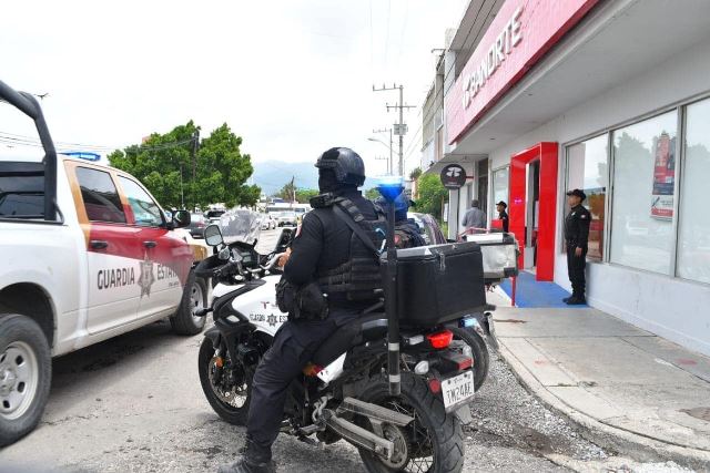 Ciudad Victoria, Tamaulipas (5-Diciembre-2025).- Con el objetivo de salvaguardar la integridad y patrimonio de las y los tamaulipecos, personal de la Guardia Estatal mantiene la presencia y vigilancia en bancos, cajeros, y otras instituciones financieras ante el pago de aguinaldos y otras prestaciones.