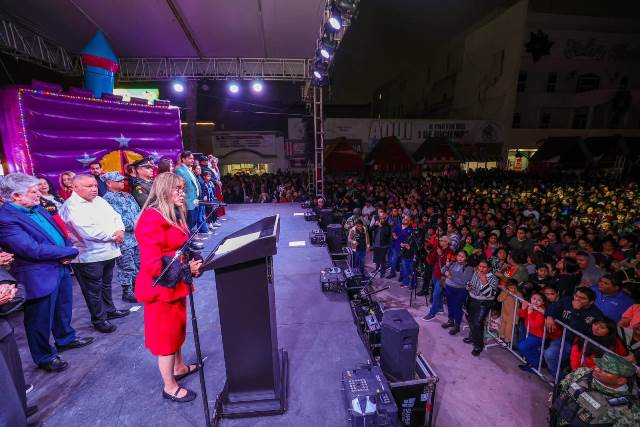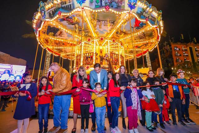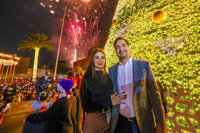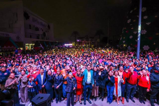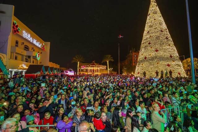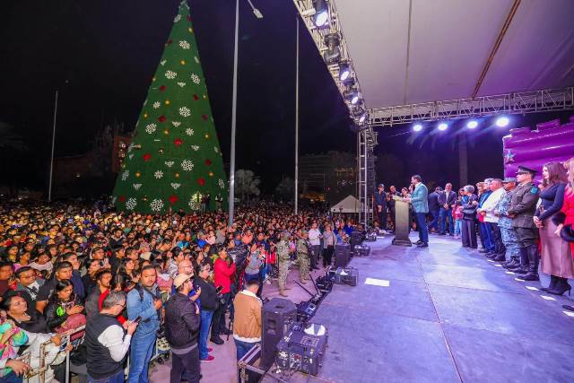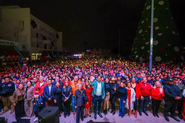 Reynosa, Tam (6-Diciembre-2025).- En un cálido ambiente con más de 10 Mil reynosenses, el Alcalde Carlos Peña Ortiz, acompañado por su esposa Alejandra Yelitza Garza, encabezó el tradicional Encendido del Pino 2025 de 27 metros de altura y 5,950 metros de luces, en la plaza Miguel Hidalgo, marcando el inicio de la temporada navideña en la ciudad, también con el Concierto de Tatiana, La Reina de los Niños y la puesta en marcha del Carrusel Infantil.