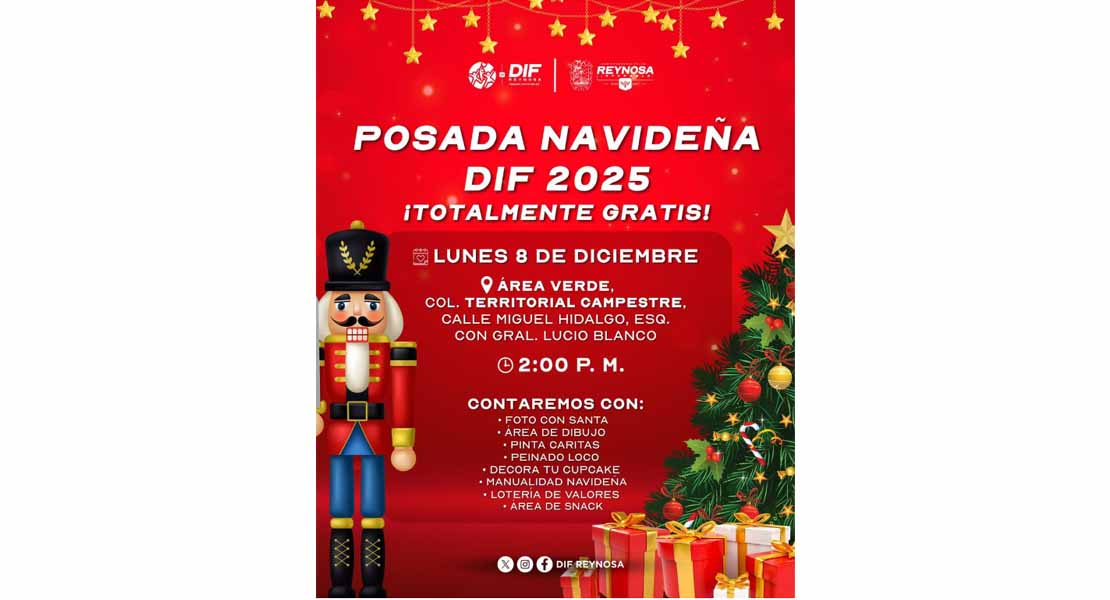 Reynosa, Tam (8-Diciembre-2025).- El Alcalde, Carlos Peña Ortiz y el DIF-Reynosa invitan a las familias a disfrutar de forma gratuita las Posadas Navideñas 2025.