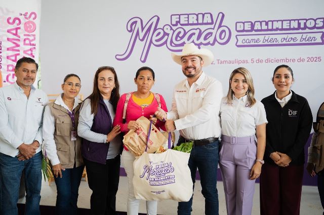 González, Tamaulipas (8-Diciembre-2025).- El Sistema para el Desarrollo Integral de la Familia de Tamaulipas, presidido por la doctora María de Villarreal, llevó a la cabecera municipal la Feria Mercado de Alimentos “Come Bien, Vive Bien”, una acción dirigida a la población abierta con atención prioritaria para grupos que requieren mayor apoyo.