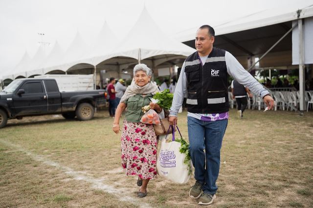 Durante la jornada se entregaron mil paquetes alimentarios integrados por hortalizas frescas cosechadas por productores regionales, además de artículos esenciales de la canasta básica. Todo fue dispuesto en una bolsa ecológica reutilizable elaborada por mujeres y hombres que participan de manera habitual en la Casa Club del Adulto Mayor y en el CEDIF Clarita Nava de Ulibarri.