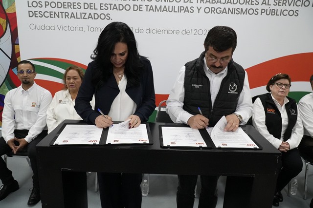 Ciudad Victoria, Tam (11-Diciembre-2025).- La Universidad Autónoma de Tamaulipas (UAT) y el Sindicato Único de Trabajadores al Servicio de los Poderes del Estado de Tamaulipas y Organismos Públicos Descentralizados (SUTSPET) formalizaron la firma de un Convenio Marco de Colaboración que establece un amplio esquema de becas, capacitación y apoyos educativos en beneficio de trabajadores sindicalizados y sus hijos.