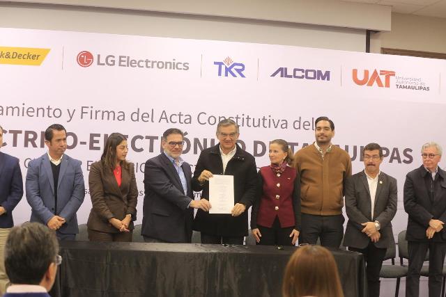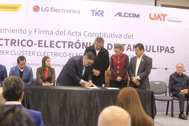 Durante la ceremonia, también quedaron formalmente registrados como miembros fundadores del Clúster Eléctrico–Electrónico de Tamaulipas: Abraham Walter Rico Murrieta, gerente senior de Comercio Exterior y representante legal de LG Electronics Reynosa; Sergio Antonio Ruiz Leal, gerente de Operaciones de TKR de México; Víctor Javier Arellano Valadez, representante de Alcom Electrónicos de México; Dámaso Leonardo Anaya Alvarado, rector de la Universidad Autónoma de Tamaulipas; y Edgar Garza Hernández, rector de la Universidad Tecnológica de Tamaulipas Norte.