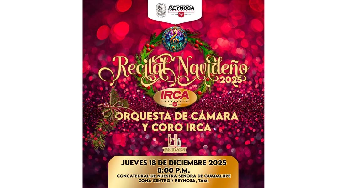 Reynosa, Tam (17-Diciembre-2025).- El Gobierno de Reynosa, que preside el Alcalde Carlos Peña Ortiz, invita al público al Recital Navideño 2025 que el Instituto Reynosense para la Cultura y las Artes presentará este jueves 18 de diciembre a las 8:00 P. M. en la Concatedral de Nuestra Señora de Guadalupe.