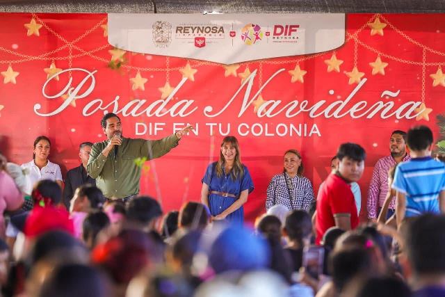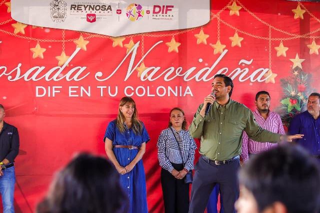Reynosa, Tam (17-Diciembre-2025).- La gran Posada DIF En Tu Colonia, 2025, fue encabezada por el Alcalde Carlos Peña Ortiz, acompañado por su esposa Alejandra Yelitza Garza, con el Presidente del Patronato del organismo, Carlos Luis Peña Garza, donde también asistió la Senadora Maki Esther Ortiz Domínguez, quien compartió regalos para las familias.