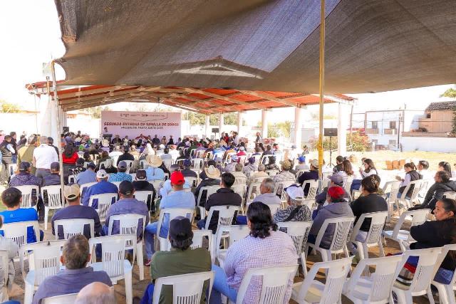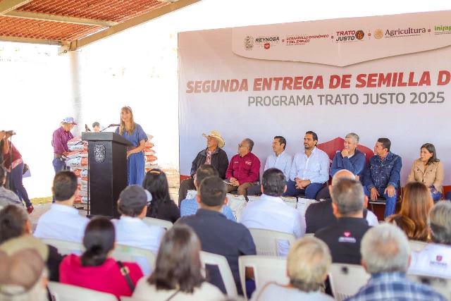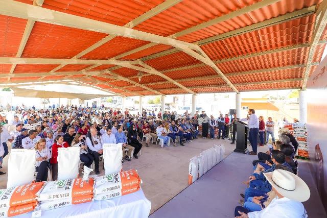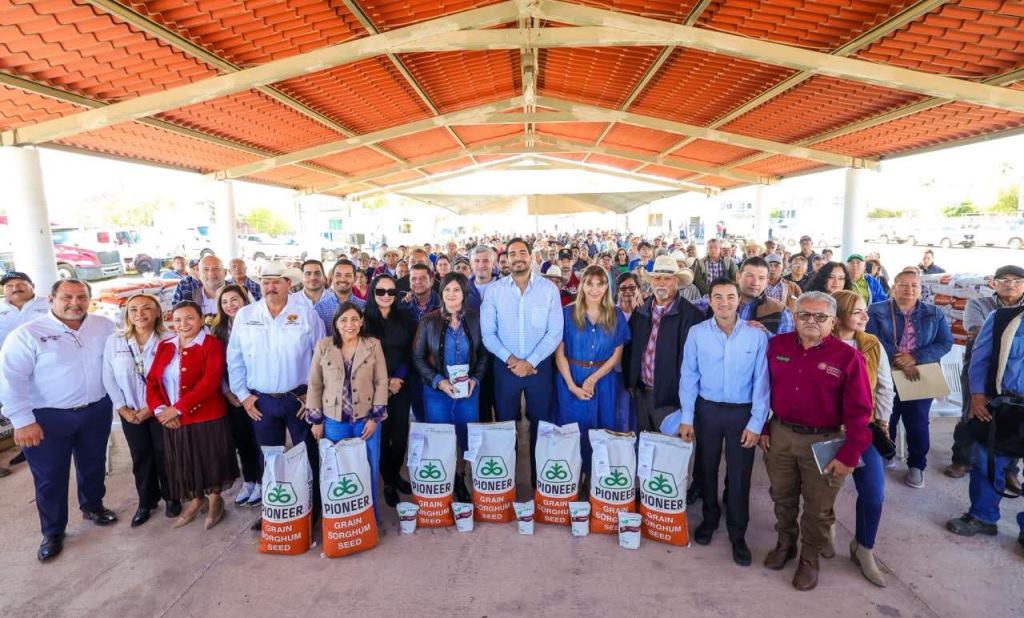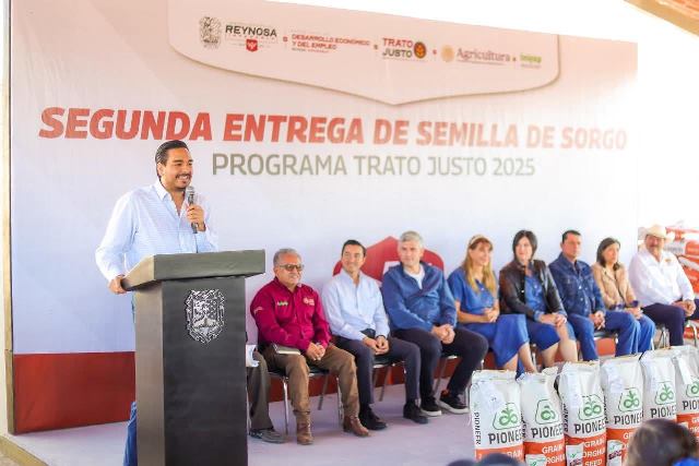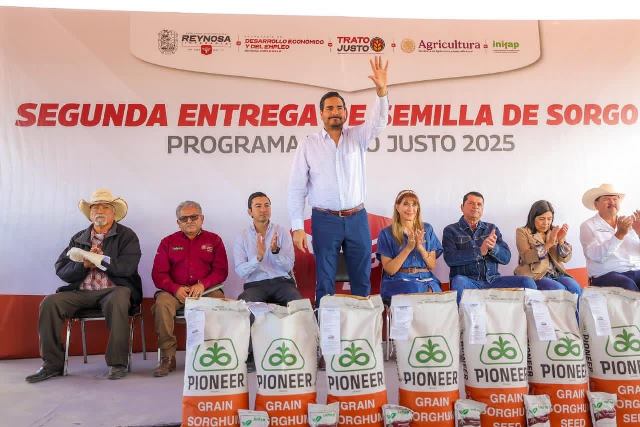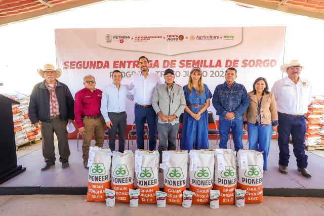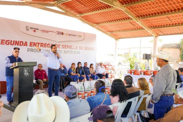 Reynosa, Tam (22-Diciembre-2025).- Al presidir la entrega de 26 toneladas y 820 kilos de semilla de sorgo a 185 productores del campo reynosense en más de 35 ejidos, mediante el programa municipal «Trato Justo», el Alcalde Carlos Peña Ortiz los invitó a analizar el cambio de cultivos: ‘tenemos que empezar a diversificar para poder mejorar rendimiento e ingreso; el sorgo dio treinta, cuarenta años pero se ha batallado muchísimo, hay que empezar a explorar la soya, el ajonjolí».