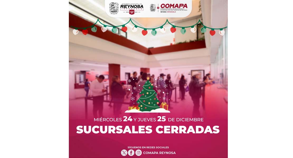 Reynosa, Tam (23-Diciembre-2025).- La Comisión Municipal de Agua Potable y Alcantarillado de Reynosa informa a los usuarios que, con motivo de las festividades navideñas, las sucursales del organismo permanecerán cerradas los días miércoles 24 y jueves 25 de diciembre.