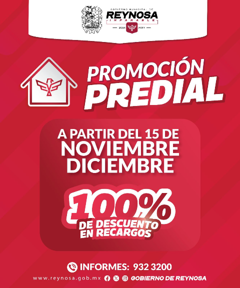 «El Gobierno Municipal de #Reynosa, que preside el Alcalde Carlos Peña Ortiz, ofrece 100% de descuento en recargos del Impuesto Predial hasta el 31 de diciembre», anunció esta tarde.