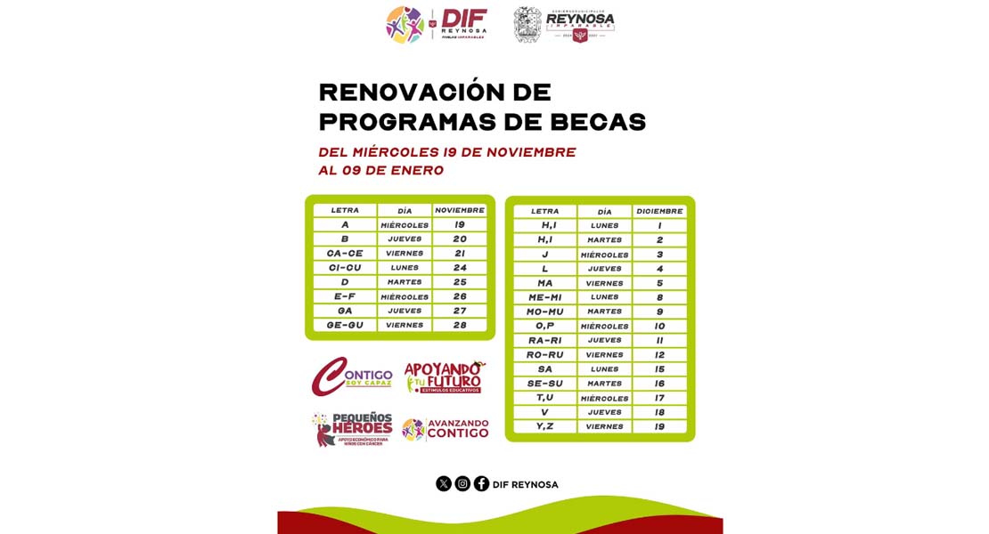 Reynosa, Tam (8-Enero-2026).- El Sistema DIF-Reynosa que preside Carlos Luis Peña Garza, continúa con el proceso de renovación de becas de los programas Contigo Soy Capaz, Apoyando Tu Futuro, Pequeños Héroes y Avanzando Contigo, a fin de apoyar a los menores de edad y adultos mayores con discapacidad, pequeños con cáncer, así como hermanos e hijos que tienen familiares en el Centro de Ejecución de Sanciones.