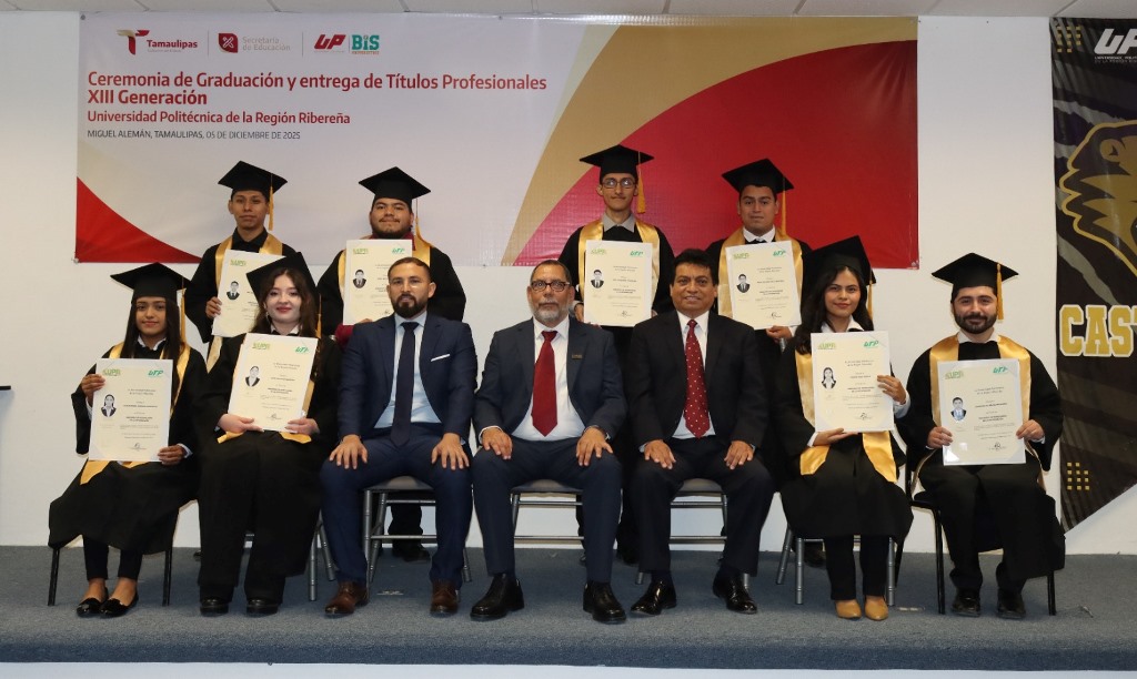 Miguel Alemán, Tamaulipas (8-Enero-2026).- La Universidad Politécnica de la Región Ribereña (UPRR) entregó a la sociedad una nueva generación de profesionistas al celebrar la ceremonia de graduación de la XIII Generación 2021–2025 de los tres programas educativos que conforman la institución.