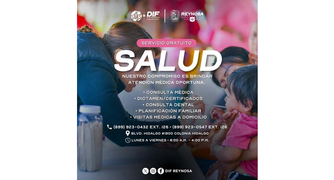 Reynosa, Tam (10-Enero-2026).- El Sistema DIF-Reynosa que preside Carlos Luis Peña Garza, mantiene a disposición de la población diversos servicios gratuitos de salud, con el objetivo de garantizar atención médica oportuna y contribuir al bienestar integral de las familias.