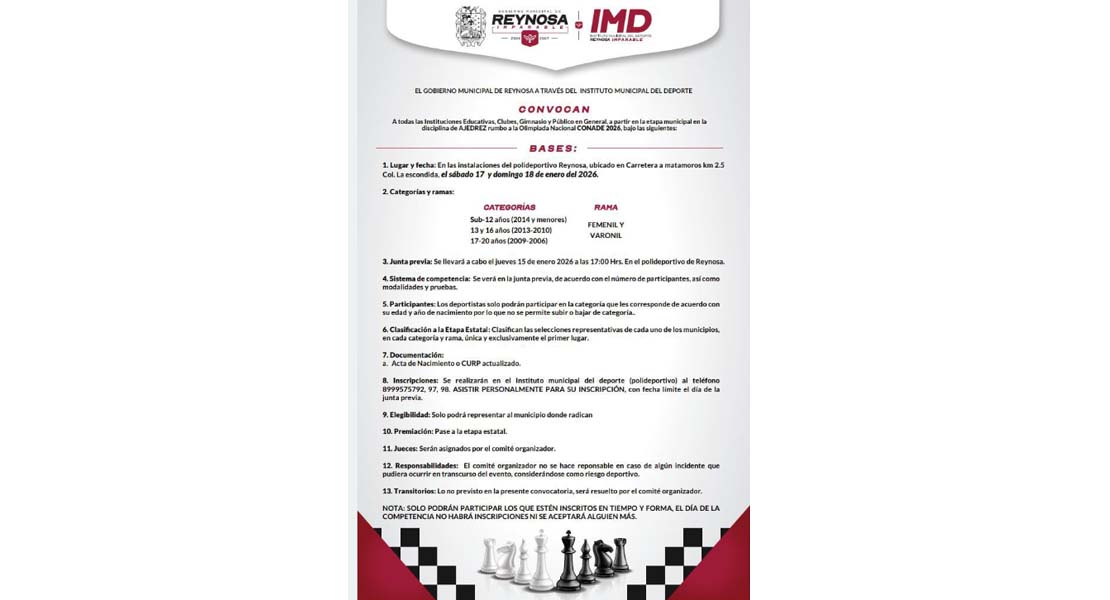 Reynosa, Tam (10-Enero-2026).- El Alcalde Carlos Peña Ortiz, invita a todas las instituciones educativas, clubes, gimnasios y al público en general a participar en la Olimpiada Municipal en la disciplina de Ajedrez, evento clasificatorio rumbo a la Olimpiada Nacional CONADE.