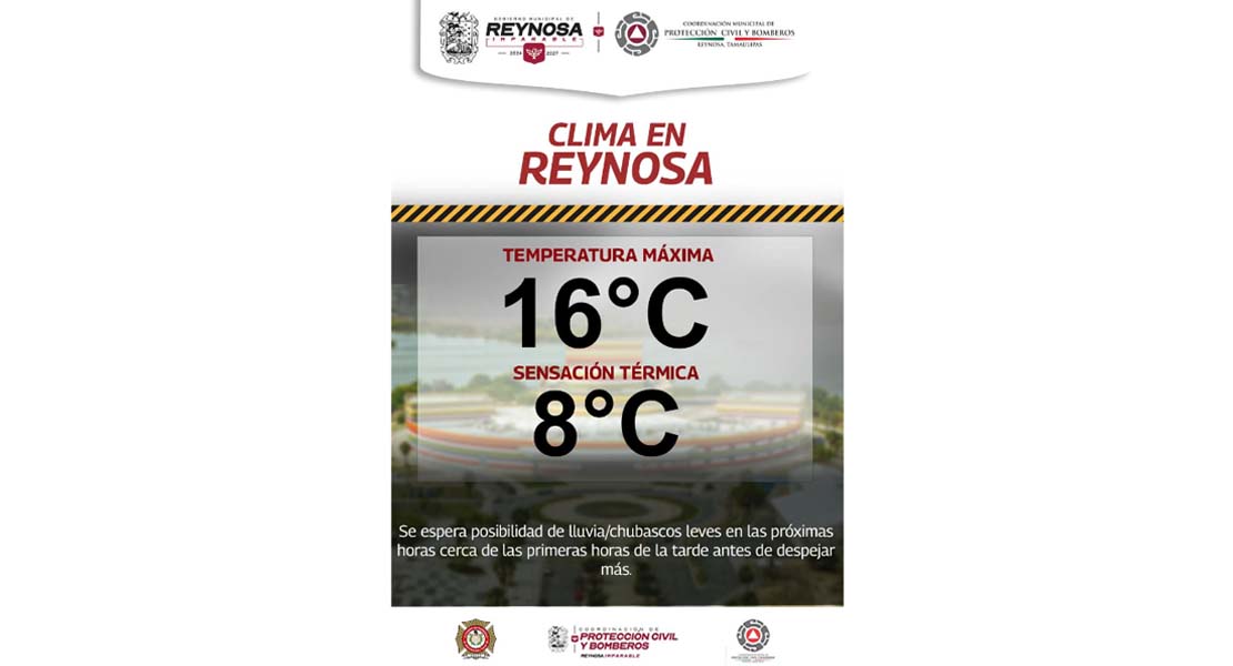 Reynosa, Tam (11-Enero-2026).- El Gobierno Municipal de Reynosa recomienda a la población tomar medidas preventivas para la protección de su salud, ya que de acuerdo al pronóstico del Servicio Meteorológico Nacional, la temperatura que podría ir abajo de 16° Centígrados, con muy alta probabilidad de lluvia para este día domingo 11 de Enero.
