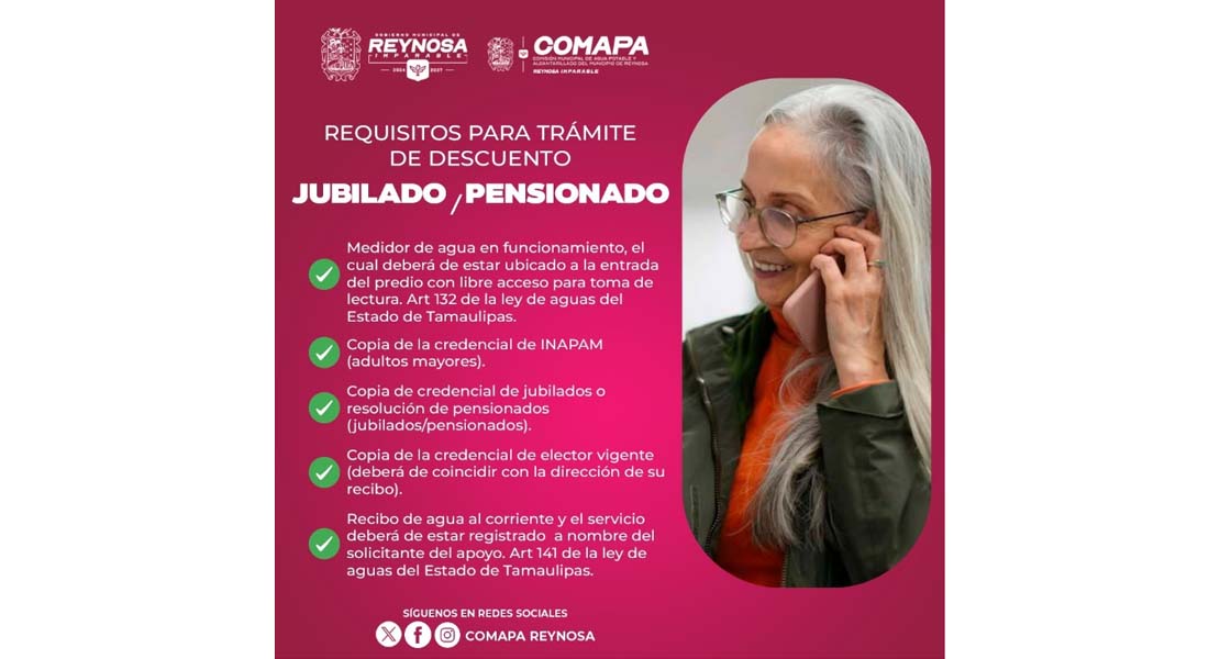 La COMAPA de Reynosa pone a disposición de los usuarios el Módulo de Jubilados, ubicado en la sucursal matriz en la colonia Longoria, donde podrán recibir mayor información y realizar el trámite correspondiente, en un horario de 8:00 A.M. a 2:30 P.M., de lunes a viernes.