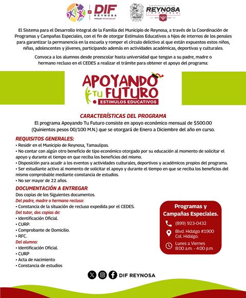 Reynosa, Tam (13-Enero-2026).- El Sistema DIF-Reynosa que preside Carlos Luis Peña Garza, dio inicio al registro de nuevo ingreso para las becas Avanzando Contigo, Apoyando Tu Futuro, Contigo Soy Capaz y Pequeños Héroes.