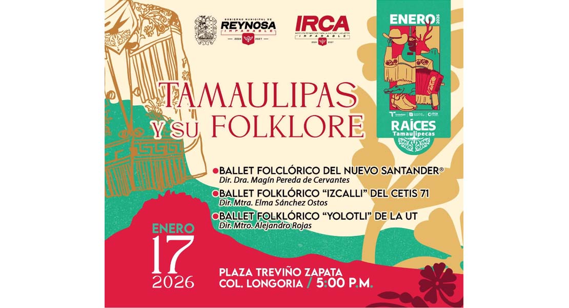 Reynosa, Tam (13-Enero-2026).- Siguiendo las instrucciones del Alcalde Carlos Peña Ortiz, el Instituto Reynosense para la Cultura y las Artes invita a disfrutar este 17 de enero de “Tamaulipas y su Folklore”, evento que reunirá grupos de danza en la plaza Treviño Zapata a las 5:00 P. M.