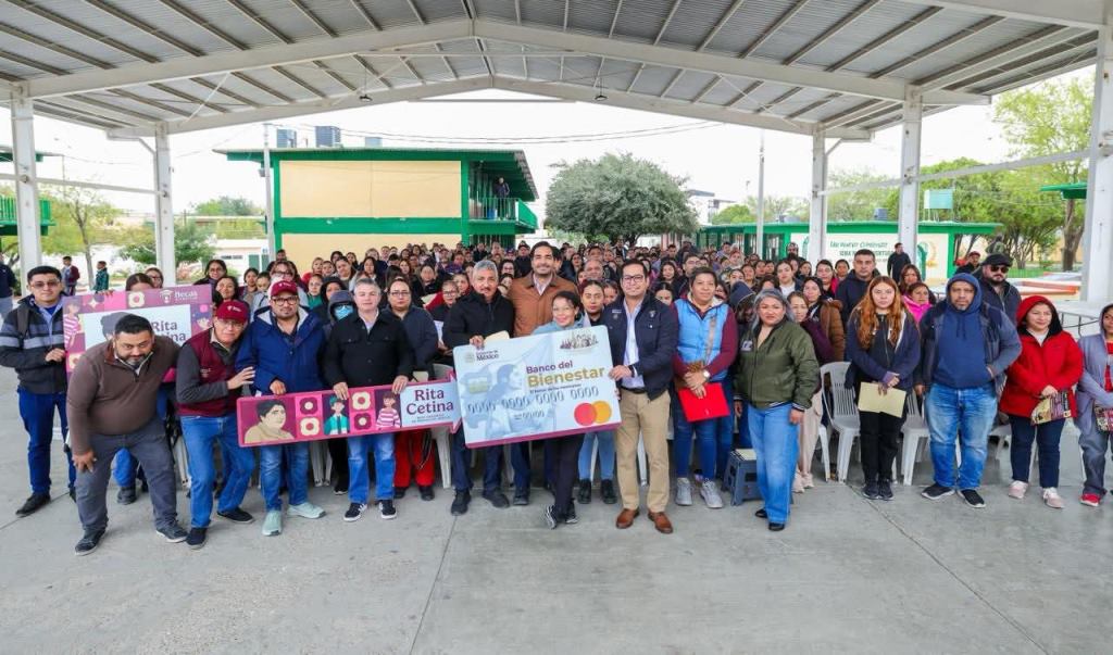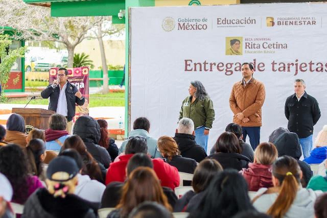 Reynosa, Tam (13-Enero-2026).- La Maestra Larissa Cantú Gómez, dio la bienvenida al Alcalde Carlos Peña Ortiz y al Coordinador de Becas para el Bienestar, Alexander Alan Bolaños, para recibir el apoyo económico escolar Rita Cetina de educación básica: «esta entrega es una oportunidad más para que nuestros alumnos, nuestros hijos, nuestras hijas puedan seguir estudiando, seguirse formando, que sean profesionistas, pongan el nombre de Reynosa en alto, por México».