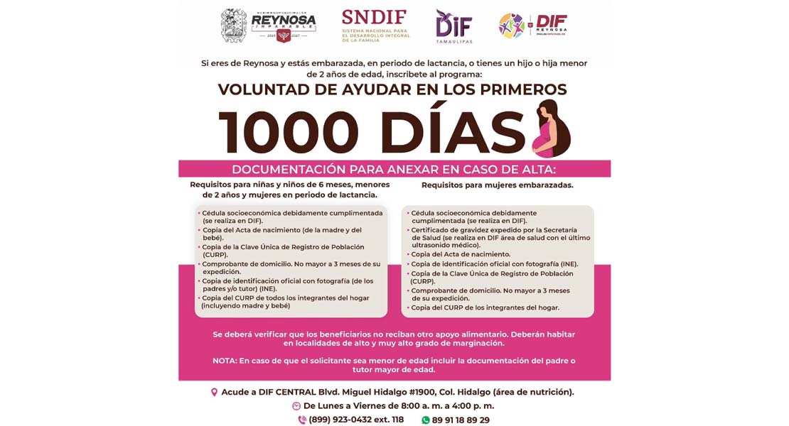 El programa prioriza la atención oportuna durante los primeros 1000 días, considerados fundamentales para sentar bases sólidas en la salud de los menores: para más información, acudir al DIF Central, ubicado en bulevar Miguel Hidalgo número 1900, en la colonia Hidalgo, en el área de nutrición, en un horario de lunes a viernes de 8:00 de la mañana a 4:00 de la tarde o mandar un mensaje al número 8991188929 vía WhatsApp.