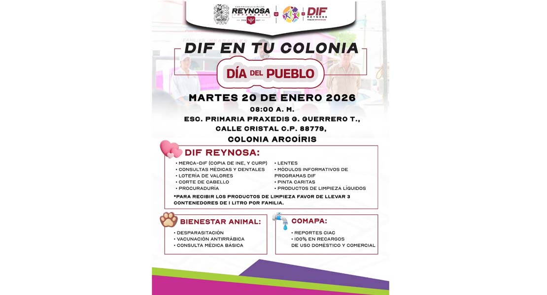 Reynosa, Tam (18-Enero-2026).- Con el objetivo de acercar servicios gratuitos a las familias, el Sistema DIF-Reynosa que preside Carlos Luis Peña Garza, llevará a cabo la brigada DIF En Tu Colonia, este martes 20 de enero a partir de las 08:00 horas en la Escuela Primaria «Práxedis G. Guerrero T.», ubicada en calle Cristal, en la colonia Arcoíris.