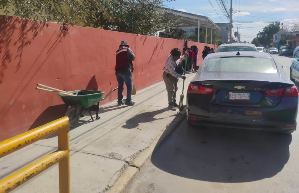 – Limpieza en la escuela primaria Praxedis G. Guerrero, ubicada en calle Cristal 507, colonia Arcoiris.
