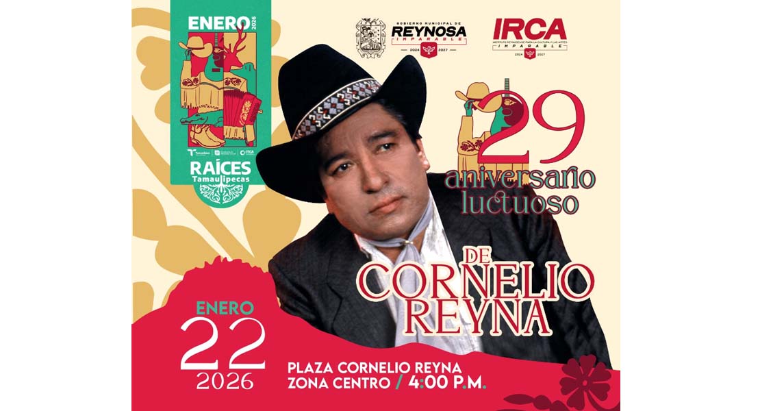 Reynosa, Tam (20-Enero-2026).- El Gobierno de Reynosa, que preside el Alcalde Carlos Peña Ortiz, invita a la ciudadanía al homenaje por el 29 aniversario luctuoso de Cornelio Reyna Cisneros este próximo 22 de enero a las 4:00 P. M. en la plaza «Cornelio Reyna», en el barrio «El Centralito».