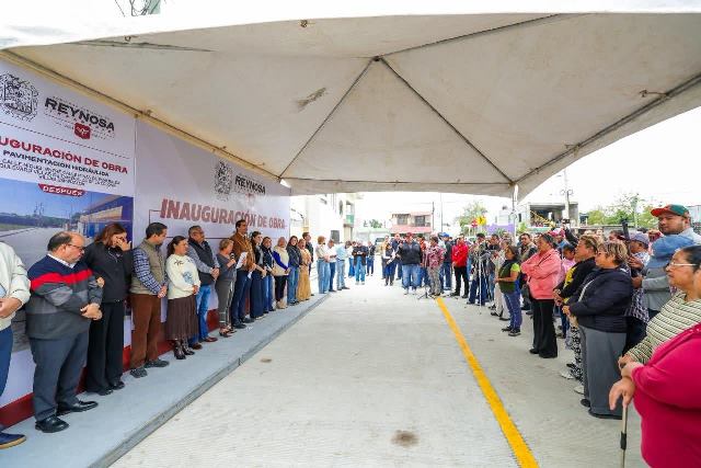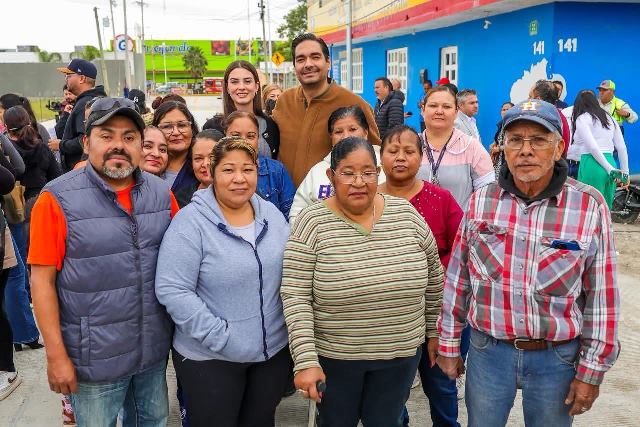 Reynosa, Tam (21-Enero-2026).- En la calle Niquel, de la colonia Villas de Esmeralda, los vecinos recibieron con mucho júbilo al Alcalde Carlos Peña Ortiz, él y su esposa la Presidenta del Voluntariado DIF-Reynosa, Alejandra Yelitza Garza, acudieron a inaugurar la nueva pavimentación hidráulica junto con las familias del sector.