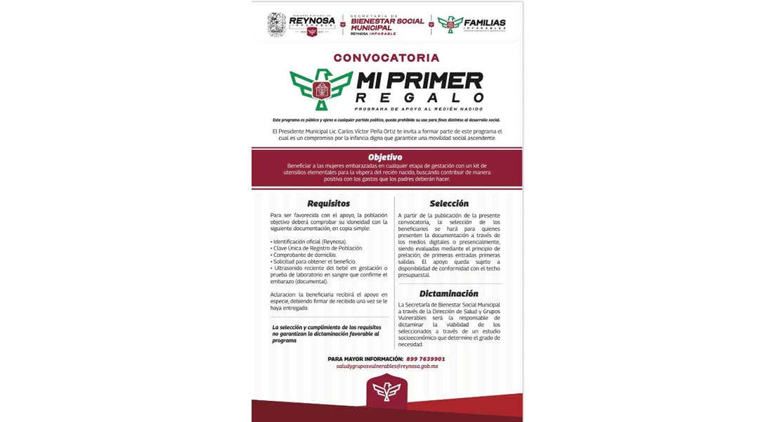 Reynosa, Tam (23-Enero-2026).- El Presidente Municipal Carlos Peña Ortiz convoca a las mujeres embarazadas a inscribirse al programa de la Secretaría de Bienestar Social Municipal «Mi Primer Regalo», dirigido a residentes de esta localidad que podrán recibir el beneficio mediante el cumplimiento de sencillos requisitos.