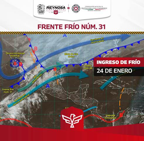 Reynosa, Tam (24-Enero-2026).- El acercamiento de la tormenta invernal que recorre los Estados Unidos causará frío congelante en la región y se prevé -1° Centígrado para la mañana de este domingo 25 de enero en Reynosa, cuando la máxima durante horas del día no rebasaría los 11°, con escasa probabilidad de precipitación pluvial.