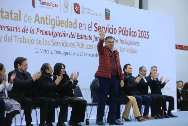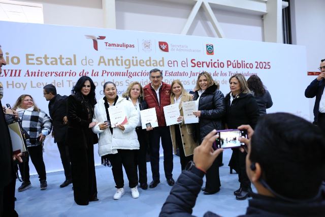 Durante la ceremonia en el Polyforum de esta capital, en la que se entregaron de manera simbólica 23 reconocimientos, medallas y estímulos económicos de un total de 1,453 a trabajadores que han cumplido entre 20 y 55 años de servicio en el Gobierno de Tamaulipas, el jefe del Ejecutivo estatal se refirió a la visita que realizó la presidenta Claudia Sheinbaum, quien trajo grandes beneficios y oportunidades para el desarrollo del estado y para seguir logrando el bienestar y la justicia social, así como coadyuvar al crecimiento y desarrollo de nuestra nación.