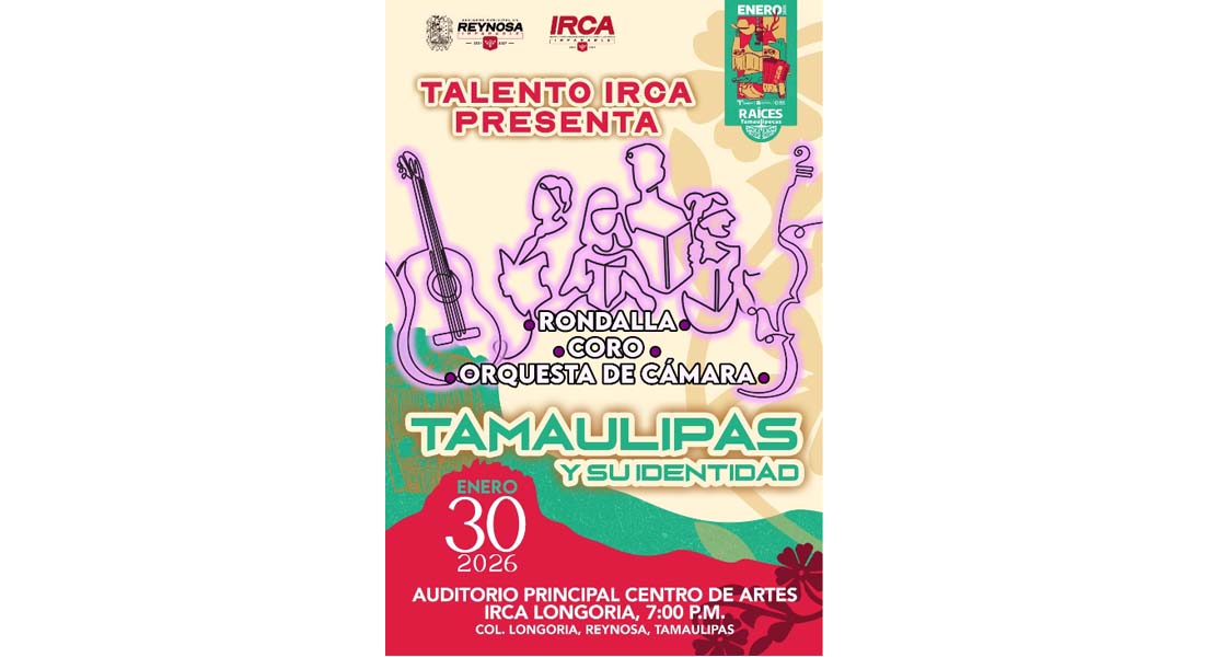 Reynosa, Tam (28-Enero-2026).- El Gobierno de Reynosa, que preside el Alcalde Carlos Peña Ortiz, invita al público a disfrutar de manera gratuita este 30 de enero de «Tamaulipas y su identidad» a las 7:00 P. M. en el Auditorio Principal del Instituto Reynosense para la Cultura y las Artes.