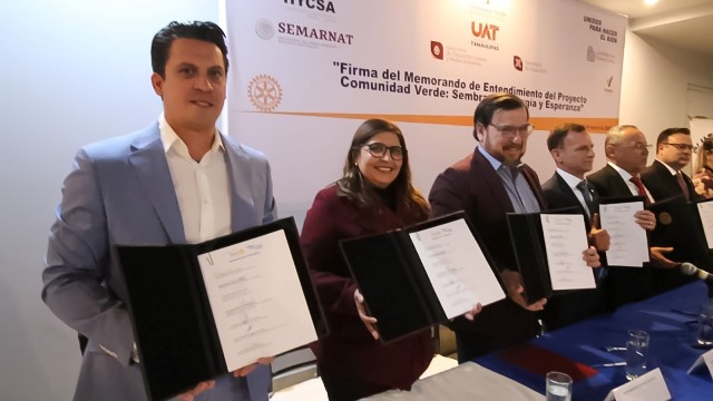 En ese marco, se llevó a cabo la firma del convenio de colaboración del proyecto Comunidad Verde, una alianza estratégica encabezada por el Club Rotary Ciudad Victoria, junto con la Secretaría de Desarrollo Urbano y Medio Ambiente (SEDUMA), la Secretaría de Educación de Tamaulipas (SET), la Universidad Autónoma de Tamaulipas (UAT), la SEMARNAT, el Gobierno municipal de Victoria, la asociación civil Latiendo por Tamaulipas y el Grupo HYCSA.