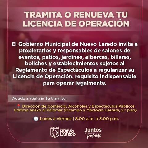 Nuevo Laredo, Tam (30-Enero-2026).- El Gobierno Municipal de Nuevo Laredo hace un atento llamado a las y los propietarios, representantes legales y responsables de salones de eventos, patios, jardines, albercas, billares y boliches, así como de establecimientos y eventos sujetos al Reglamento de Espectáculos, a tramitar o renovar su Licencia de Operación vigente, requisito indispensable para operar de manera legal dentro del municipio.