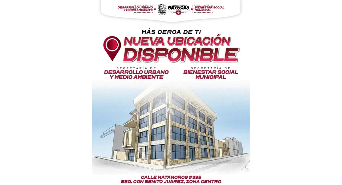 Reynos, Tam (1-Febrero-2026).- La Secretaría de Desarrollo Urbano y Medio Ambiente del Gobierno de Reynosa invita a los ciudadanos que requieren de hacer trámites de su competencia a su nueva ubicación, en calle Juárez esquina con Matamoros en la Zona Centro.