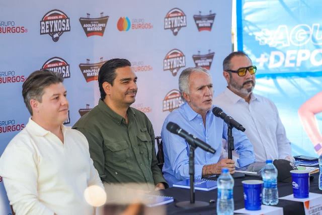 Reynosa, Tam ((4-Febero-2026).- El Alcalde Carlos Peña Ortiz dio a conocer la próxima celebración de juegos de preparación de la Liga Mexicana de Beisbol «AAA» en el parque Adolfo Lopez Mateos, acompañado por el Presidente del Club Rieleros de Aguascalientes, Eustacio Álvarez Flores; por Saúl Soto Castro, Director del Instituto Municipal del Deporte y por Patricio García Luebbert, Director Deportivo del estadio.