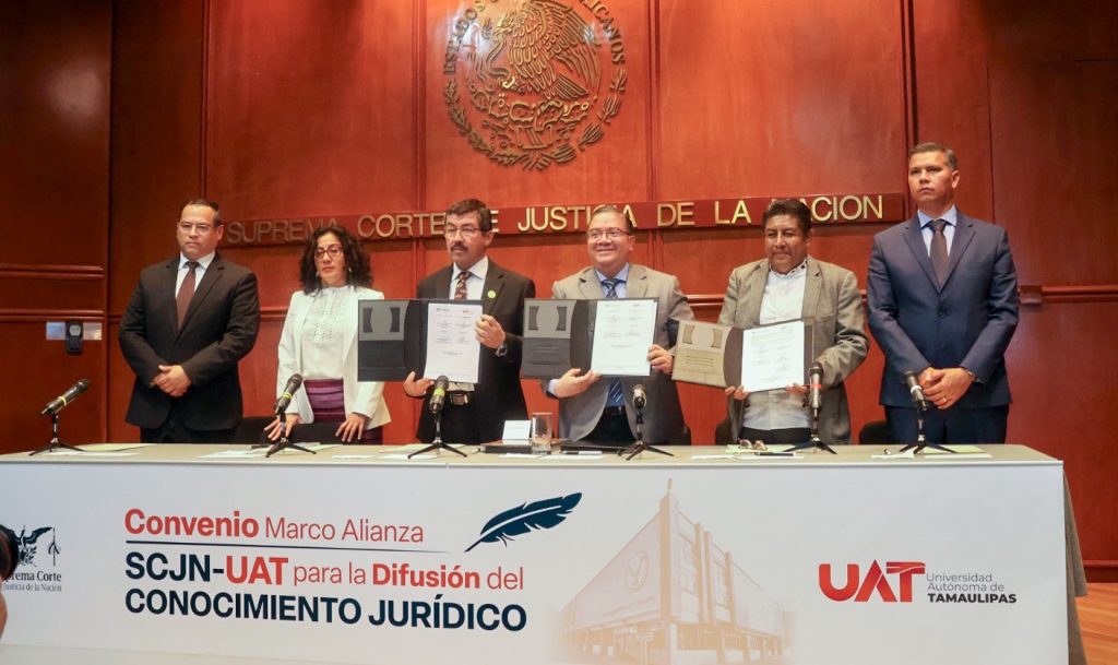 Ciudad de México (5-Febrero-2026).- La Universidad Autónoma de Tamaulipas (UAT) y la Suprema Corte de Justicia de la Nación (SCJN) suscribieron el Convenio Marco Alianza SCJN–UAT para la Difusión del Conocimiento Jurídico, así como un convenio específico en materia de servicio social.
