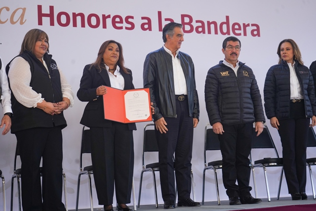 Ciudad Victoria, Tam (9-Febrero-2026).- El gobernador Américo Villarreal Anaya, junto con el rector de la Universidad Autónoma de Tamaulipas (UAT), Dámaso Anaya Alvarado, encabezó este lunes la ceremonia de honores a la bandera y atestiguó la toma de protesta de la Dra. María Guadalupe Vázquez Salazar como directora de la Facultad de Enfermería Victoria para el periodo 2026-2029.