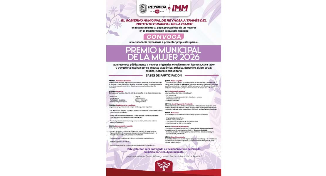 Reynosa, Tam (12-Febrero-2026).- El Gobierno Municipal que preside Carlos Peña Ortiz está recibiendo las propuestas ciudadanas para participar en la Convocatoria del Premio Municipal de la Mujer 2026, un reconocimiento público a mujeres originarias o residentes en Reynosa, con labor y trayectoria que inspiran en el ámbito académico, artístico, deportivo, cívico, social, político cultural o comunitario.