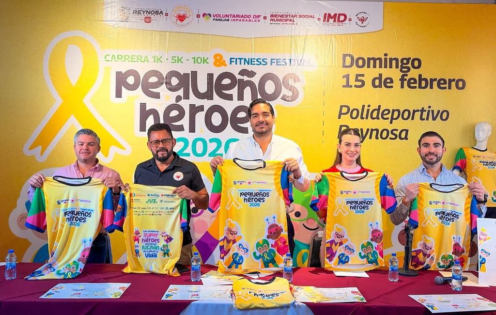 Reynosa, Tam (13-Febrero-2026).- El Alcalde Carlos Peña Ortiz y su esposa Alejandra Yelitza Garza dieron a conocer, acompañados por Jorge Mar Gea, Presidente de la Fundación Iluminando Corazones A. C., detalles importantes de la Carrera 1K, 5K, 10K y Fitness Festival Pequeños Héroes 2026 Reynosa, a celebrarse este domingo 15 de febrero a partir de las 7:00 de la mañana en el Polideportivo.