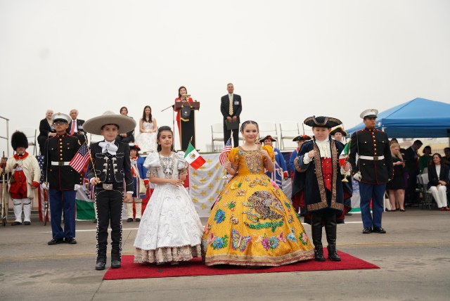 Durante el evento, niñas y niños embajadores de México y Estados Unidos protagonizaron el tradicional abrazo, portando trajes típicos que representan la riqueza cultural de ambas naciones, en un gesto que simboliza el futuro compartido de esta región.