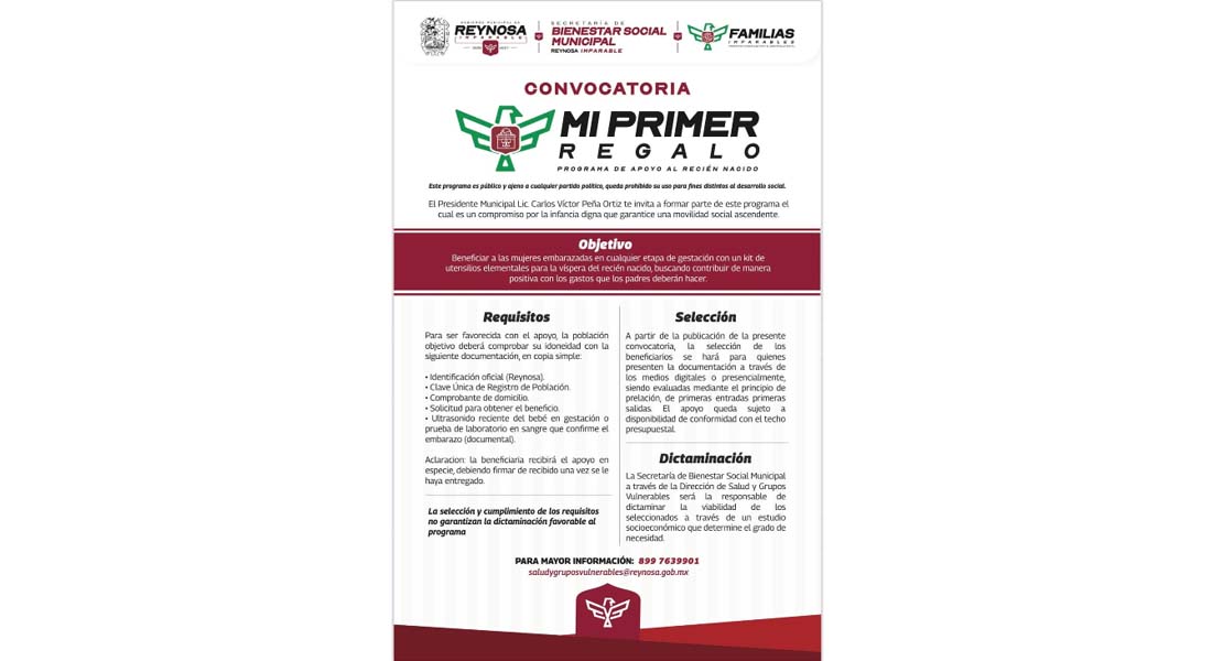 Reynosa, Tam (21-Febrero-2026).- El Alcalde Carlos Peña Ortiz invita a las mujeres embarazadas que residan en Reynosa, a inscribirse al programa municipal «Mi Primer Regalo», y puedan recibir el beneficio social mediante el cumplimiento de sencillos requisitos.