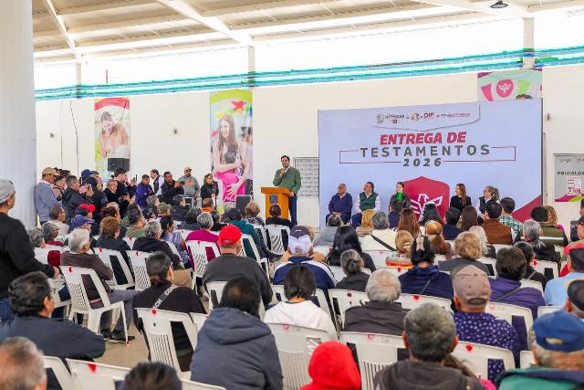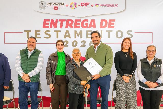 Reynosa, Tam (23-Febrero-2026).- El Alcalde Carlos Peña Ortiz presidió este lunes 23 de febrero la ceremonia de Entrega de Testamentos 2026 que benefició a 55 adultos mayores de 65 años, siendo acompañado por su esposa, la Presidenta del Voluntariado DIF-Reynosa, Alejandra Yelitza Garza, impulsora de la iniciativa.