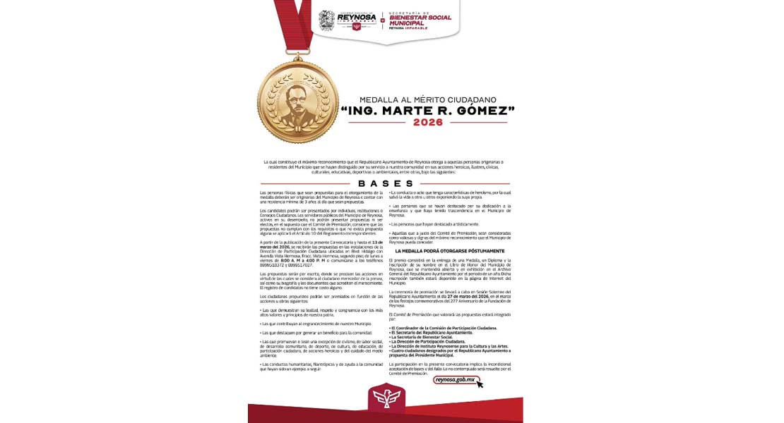 Reynosa, Tam (24-Febrero-2026).- El Alcalde Carlos Peña Ortiz hace una invitación a la sociedad reynosense a la Convocatoria Medalla al Mérito Ciudadano «Ing. Marte R. Gómez» 2026, dirigida a aquellas personas originarias o residentes del Municipio que se hayan distinguido por su servicio a nuestra comunidad en sus acciones heroicas, ilustres, cívicas, culturales, educativas, deportivas o ambientales.