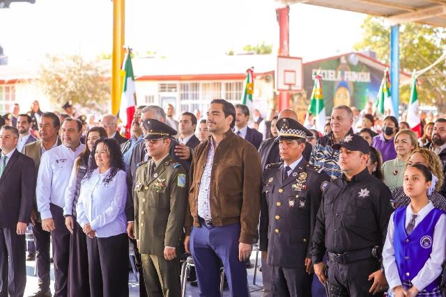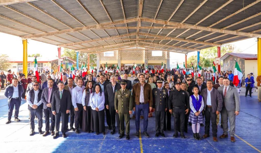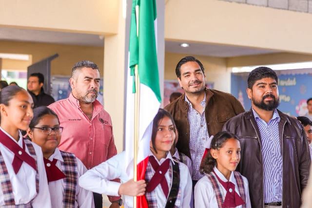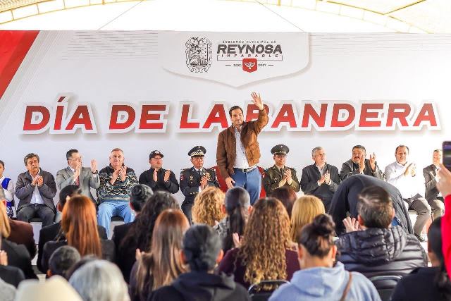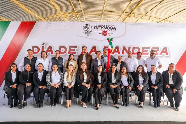 Reynosa, Tam (24-Febrero-2026).- El Presidente Municipal Carlos Peña Ortiz participó este día, martes 24 de febrero, en la Ceremonia Cívica del Día de la Bandera de México 2026, acompañado por el Teniente Coronel Francisco Javier Delgado Gil, Segundo Comandante del 19° Regimiento de Caballería Motorizado de la Octava Zona Militar y el Diputado Local Juan Carlos Zertuche Romero, en la escuela primaria Escudo Nacional, que dirige el Profesor Rodolfo Herrera Vázquez.