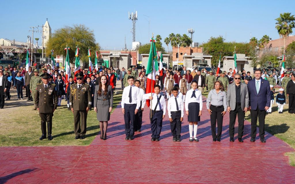 Nuevo Laredo, Tam (24-Febrero-2026).- Con un firme mensaje de unidad, respeto y amor a los símbolos nacionales, el Gobierno Municipal que lidera la alcaldesa Carmen Lilia Canturosas Villarreal presidió la conmemoración del Día de la Bandera, en una emotiva ceremonia de Honores al lábaro patrio y Abanderamiento de Escoltas en el Parque Morelos, donde 30 instituciones educativas fueron abanderadas en un acto solemne que fortalece la identidad y el orgullo mexicano de las nuevas generaciones.