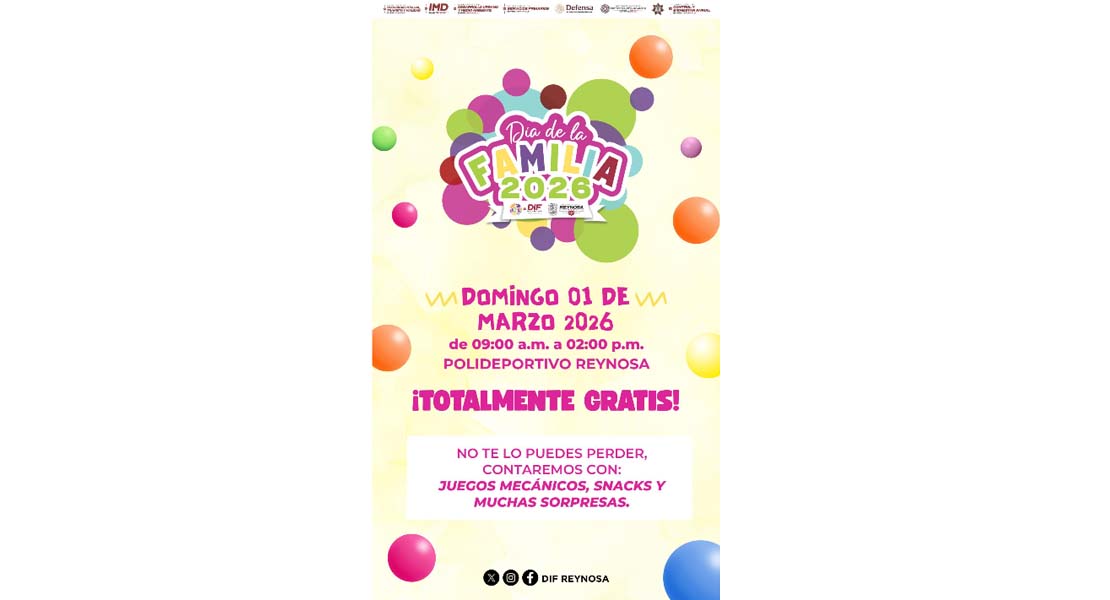 Reynosa, Tam (25-Febrero-2026).- En el marco de las celebraciones por el Aniversario de la Fundación de la ciudad, el Alcalde, Carlos Peña Ortiz, a través del Sistema DIF-Reynosa que preside Carlos Luis Peña Garza, invita a las familias a participar en el Día de la Familia, un evento diseñado para fortalecer la convivencia y promover los valores familiares en un ambiente sano y recreativo.